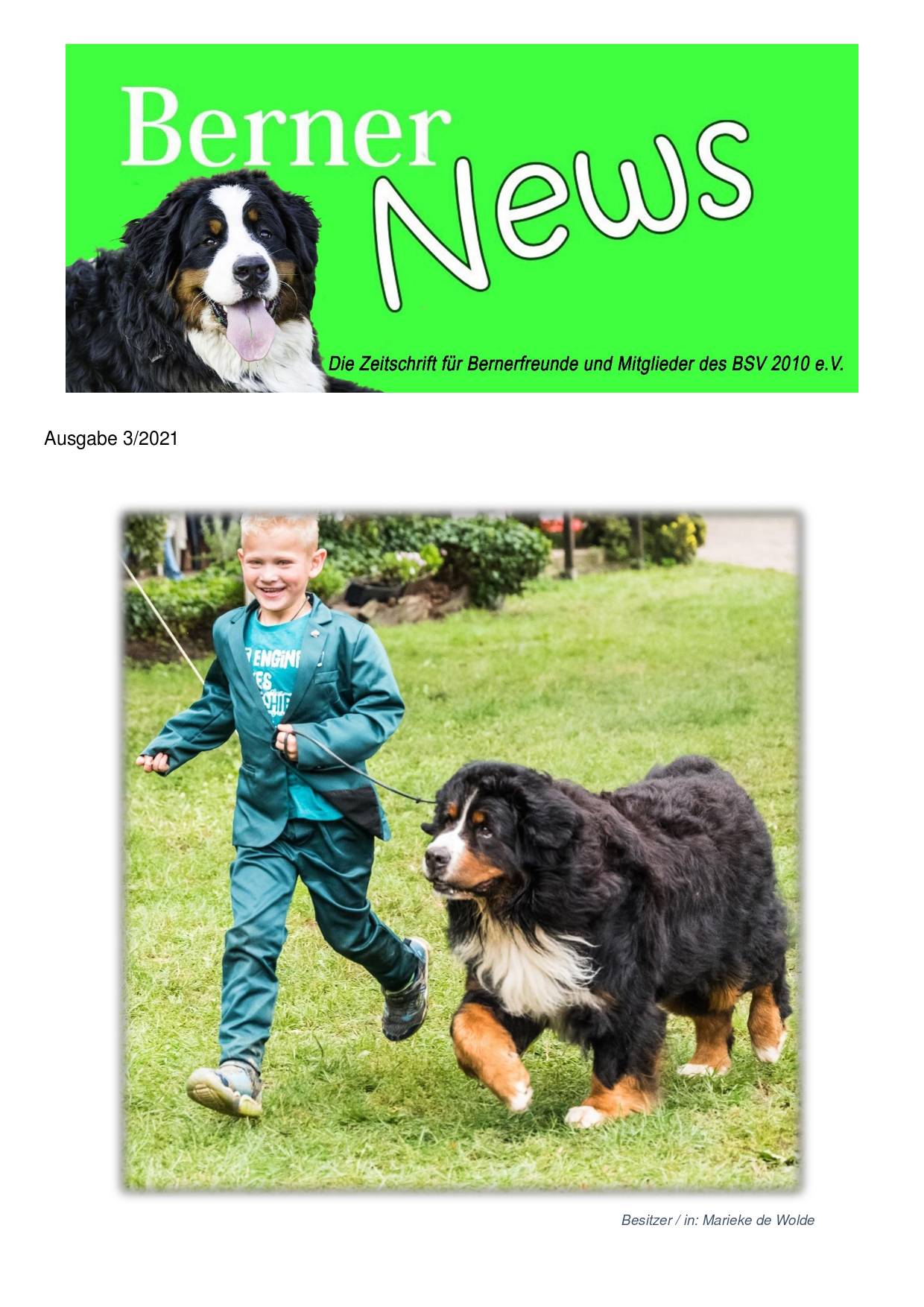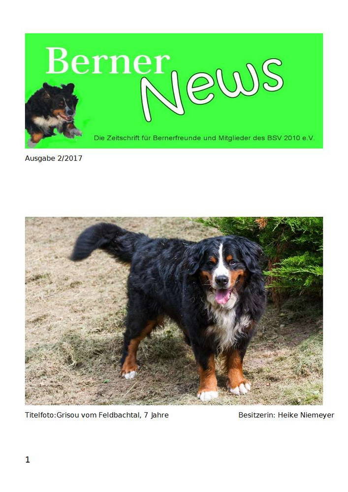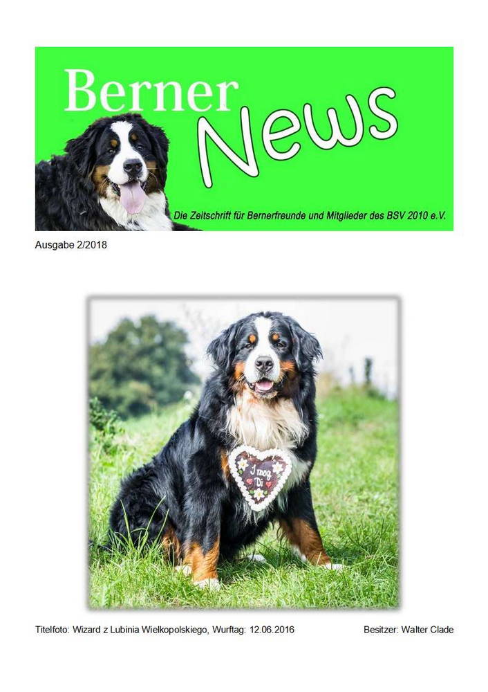 Die Berner News ist die vereinseigene Zeitschrift des Berner Sennenhunde Verein 2010 e.V. und erscheint seit 2015 bis zu viermal jährlich. Neben vereinsinternen Mitteilungen, Meldungen und Nachrichten, enthält sie stets auch interessante Artikel und Tipps rund um das Zusammenleben mit dem Berner Sennenhund. Die Berner News ist kostenlos und exclusiv für die Mitglieder des Berner Sennenhunde Verein 2010 e.V. und wird diesen auf dem Postweg zugestellt.