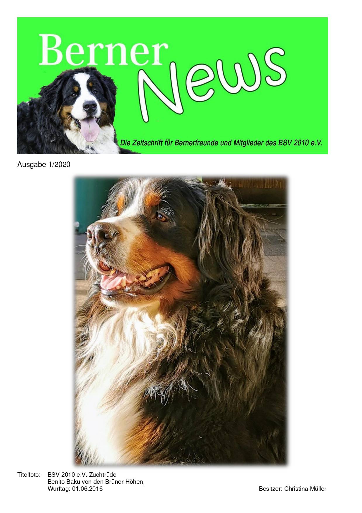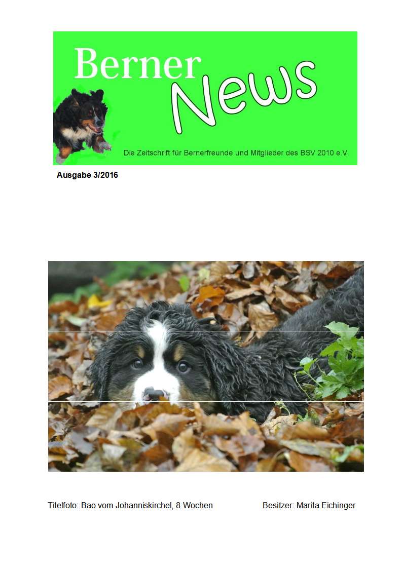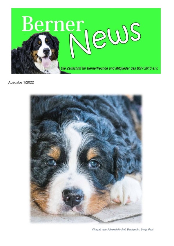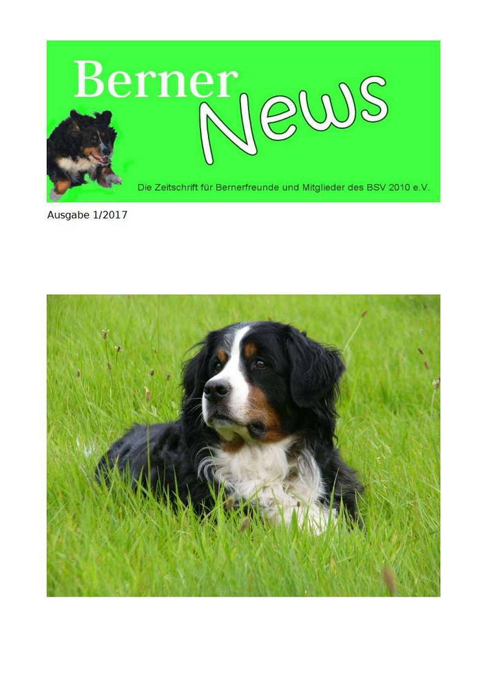 Die Berner News ist die vereinseigene Zeitschrift des Berner Sennenhunde Verein 2010 e.V. und erscheint seit 2015 bis zu viermal jährlich. Neben vereinsinternen Mitteilungen, Meldungen und Nachrichten, enthält sie stets auch interessante Artikel und Tipps rund um das Zusammenleben mit dem Berner Sennenhund. Die Berner News ist kostenlos und exclusiv für die Mitglieder des Berner Sennenhunde Verein 2010 e.V. und wird diesen auf dem Postweg zugestellt.